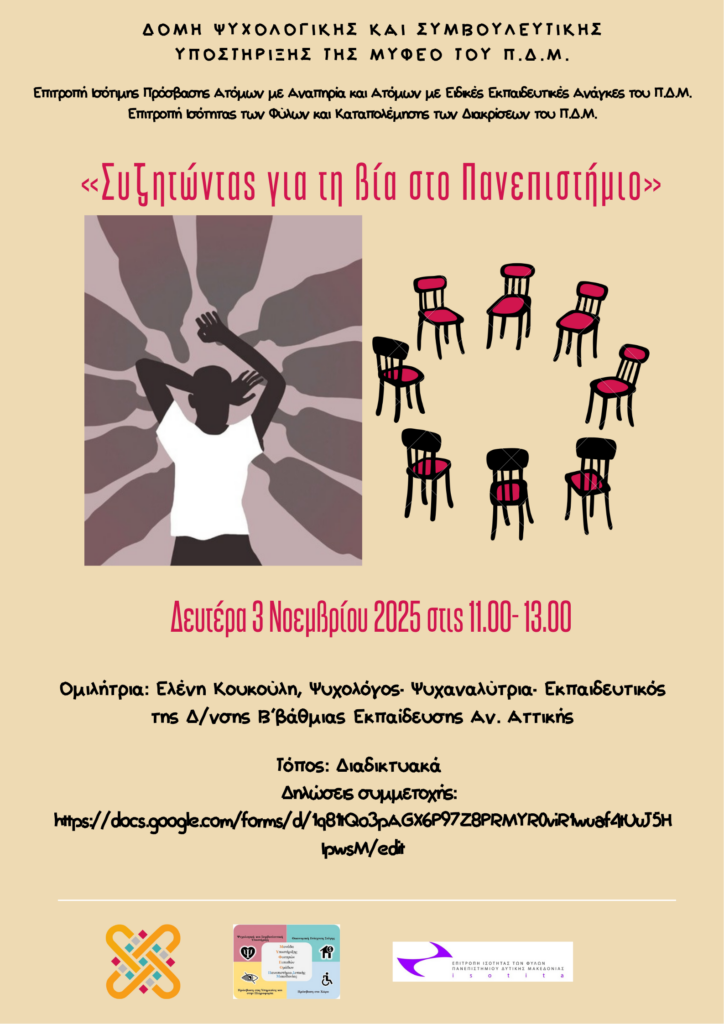 Στο πλαίσιο λειτουργίας της Δομής Ψυχολογικής και Συμβουλευτικής Υποστήριξης (ΔΟ.ΨΥ.Σ.Υ.) της Μονάδας Υποστήριξης Φοιτητών Ευπαθών Ομάδων (ΜΥΦΕΟ) του Πανεπιστημίου Δυτικής Μακεδονίας (Π.Δ.Μ.), η οποία χρηματοδοτείται από το Έργο «Ψυχολογική και Συμβουλευτική Υποστήριξη Ανθρώπινου Δυναμικού ΠΔΜ (κωδ. rescom: 81081)», ανακοινώνουμε τη διοργάνωση νέας δράσης με τίτλο: «Συζητώντας για τη βία στο Πανεπιστήμιο». Κεντρική ομιλήτρια θα είναι η κα Ελένη Κουκούλη, Ψυχολόγος, Ψυχαναλύτρια, και Εκπαιδευτικός και της Διεύθυνσης Δευτεροβάθμιας Εκπαίδευσης Ανατολικής Αττικής.